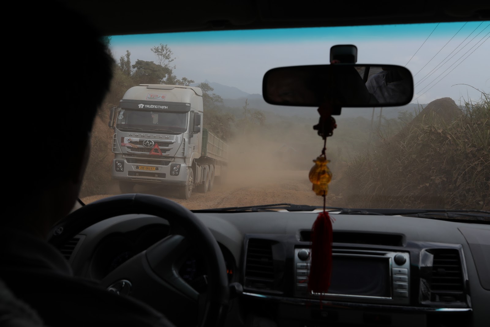 さて、実際行って見るとSekong から1時間ほどは舗装道路でしたが、その先は雨季にはどんなことになるかと心配になるような悪路にしばしば遭遇しました。理由はすぐに分かりました。大型のトレーラーがひっきりなしに行きかい、これらが道を壊しているのです。ラオス中部では鉱物(金・銅・セメント)を中国に運ぶトラックが何百台と走り回って、道路を壊し、絶えることのないもうもうたる土煙は道路周辺の住民にとってさぞ迷惑千万だろうと思っていましたが、こちらはこちらで、ベトナムに物資(建設用の岩石・セメント)を運ぶトラックの大群が列をなして国境へ向かっています。